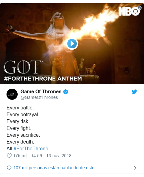 La noticia fue dada a conocer en un video en la cuenta de Twitter de HBO este martes: pueden marcar en sus calendarios el mes de abril de 2019.